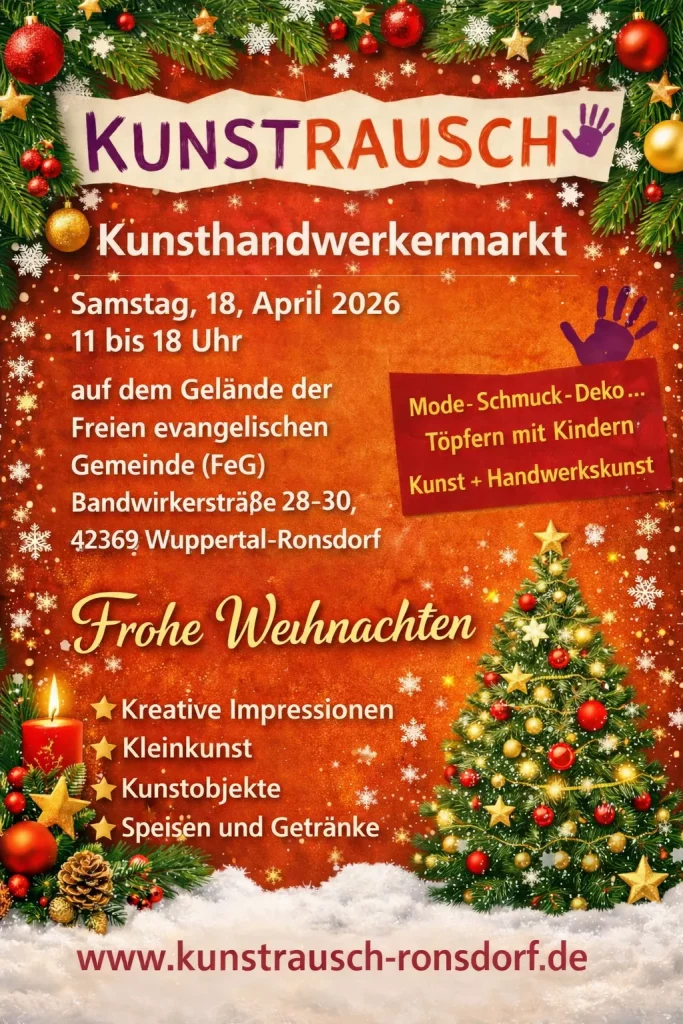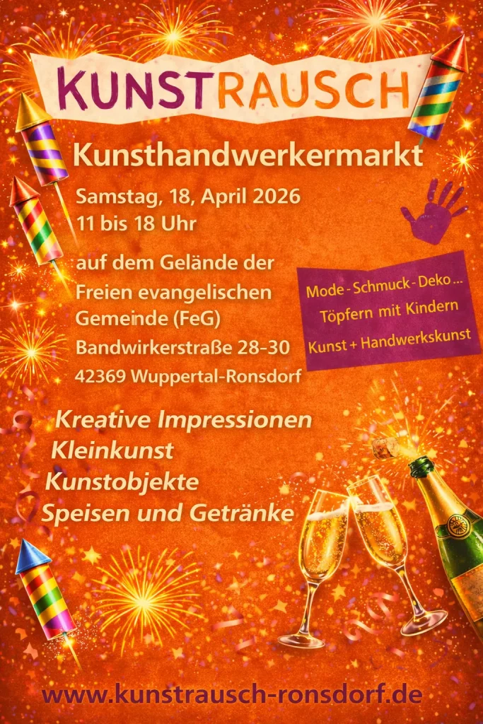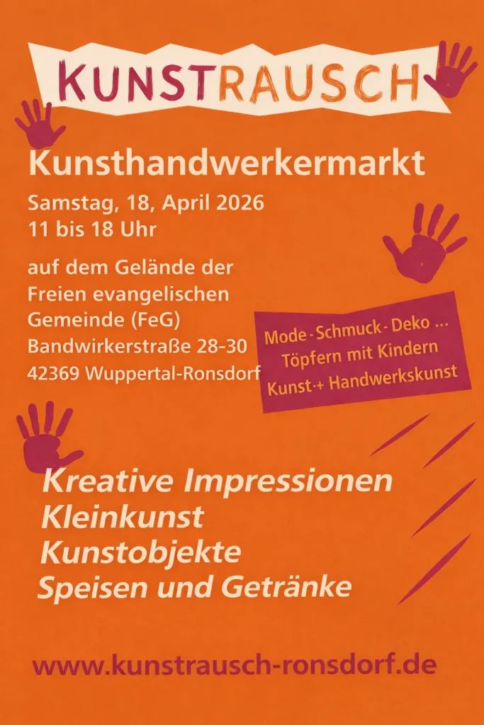 Der beliebte Kunsthandwerkermarkt Kunstrausch macht sich bereit für ein neues Kapitel! Am 18. April 2026 zieht der Markt zum ersten Mal in die modernen Räumlichkeiten der Freien evangelischen Gemeinde (FeG) Wuppertal-Ronsdorf) in der Bandwirkerstraße 28-30. Das Organisationsteam freut sich riesig über diese Kooperation – ein echter Gewinn für alle Beteiligten.