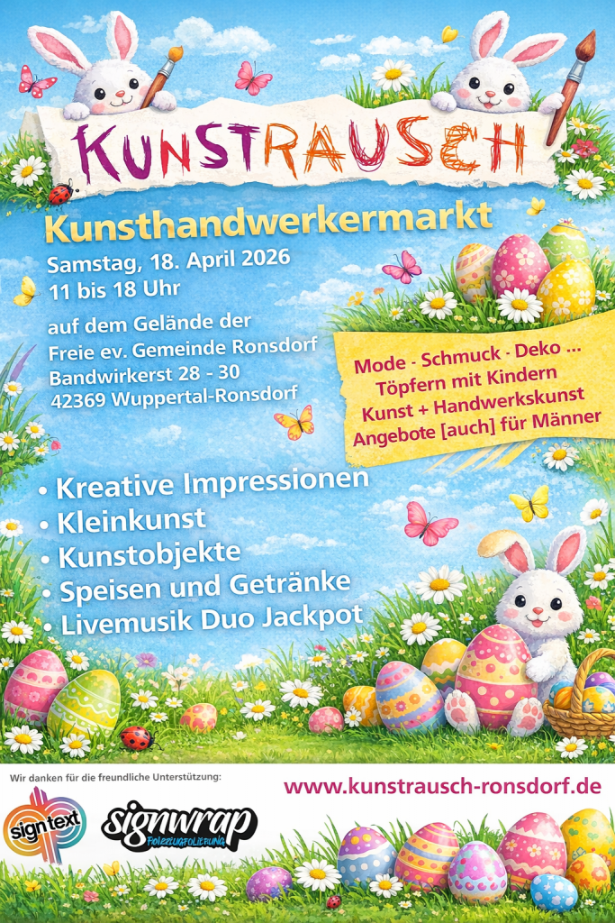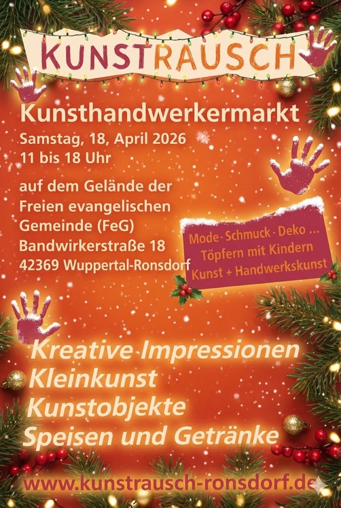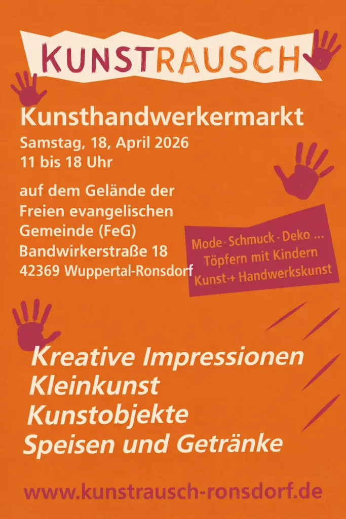 Der beliebte Kunsthandwerkermarkt Kunstrausch macht sich bereit für ein neues Kapitel! Am 18. April 2026 zieht der Markt zum ersten Mal in die modernen Räumlichkeiten der Freien evangelischen Gemeinde (FeG) Wuppertal-Ronsdorf) in der Bandwirkerstraße 28-30. Das Organisationsteam freut sich riesig über diese Kooperation – ein echter Gewinn für alle Beteiligten.